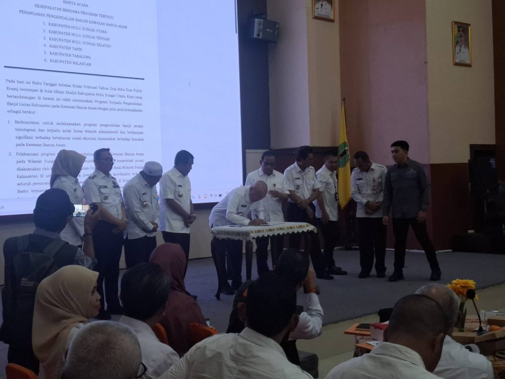 Hal ini mengemuka dalam Rapat Koordinasi Rencana Pengendalian Banjir Kawasan Banua Anam Provinsi Kalimantan Selatan yang dipimpin langsung oleh Gubernur Kalimantan Selatan, H. Muhidin, di Aula Idham Khalid, Amuntai, Kabupaten Hulu Sungai Utara, Rabu (11/2/2026) lalu.